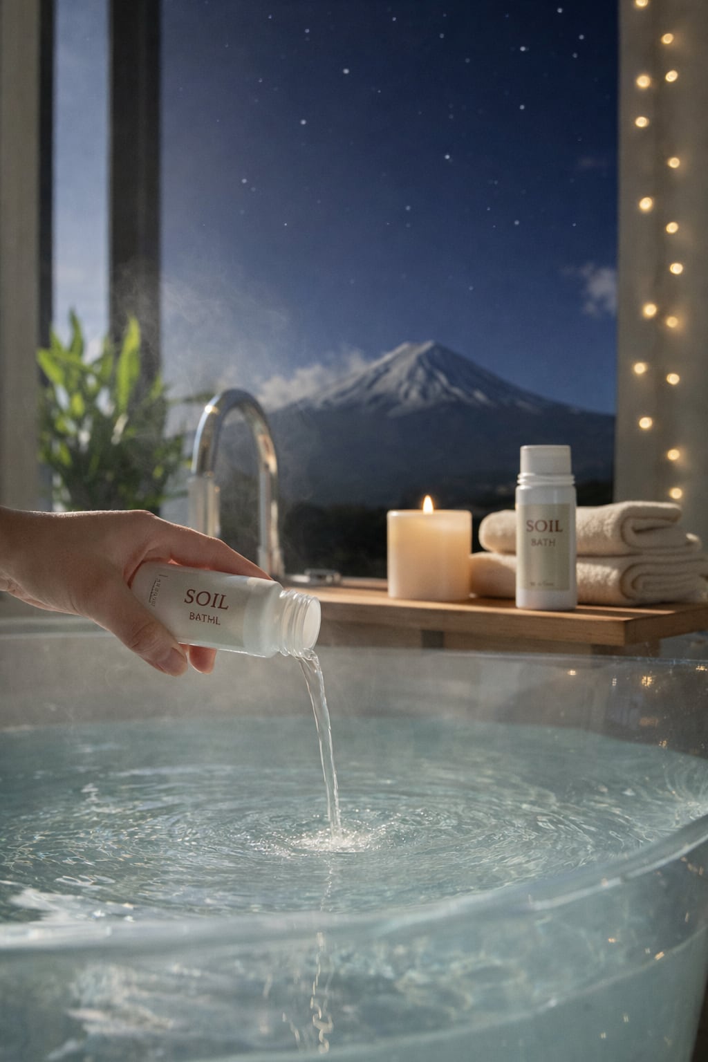 お湯に溶かすと、混じりけのない無色透明な質感が肌を包み込みます。余計な着色をせず、純粋に「お湯」の力を引き出すことで、まるで富士山の麓の湧き水に浸かっているような、澄み切った入浴体験をお届けします。